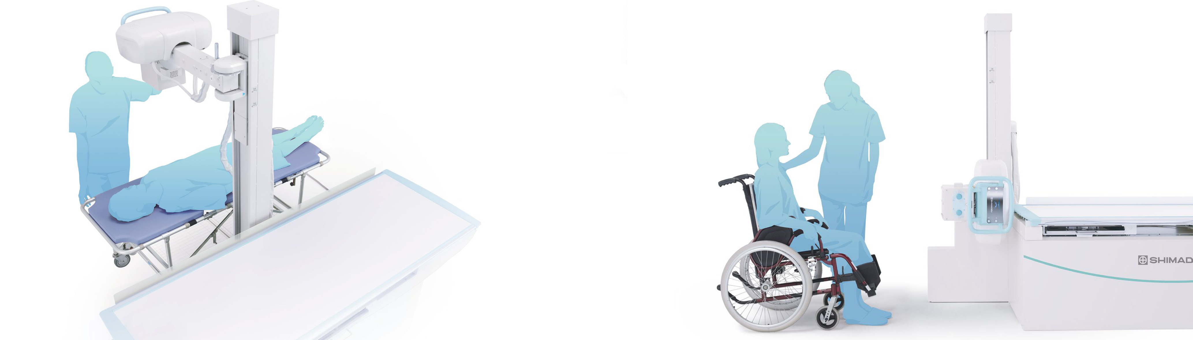 Der Röntgenstativarm kann um 180° um die Stativsäule geschwenkt werden, so dass auch entlang der Rückseite des Tischs radiographische Aufnahmen von Patienten auf einer Liege oder im Rollstuhl gemacht werden können. Der Patient braucht nicht auf den Untersuchungstisch.